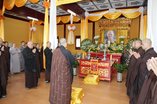 上午九时许,将初步拣出之部分舍利供奉于灵堂内,大众排班,念佛瞻礼。