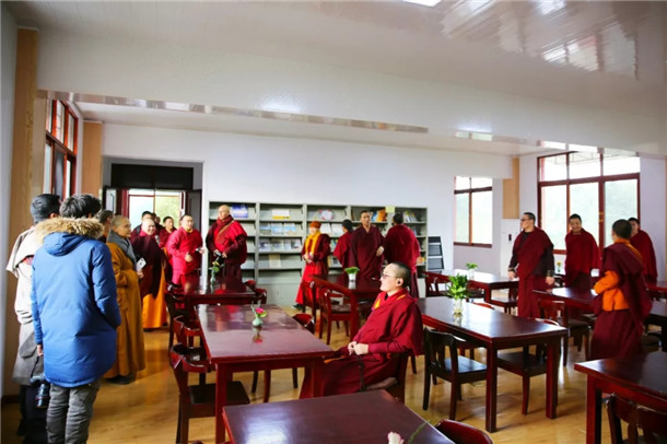 首先,如意法师代表四川尼众佛学院对四川藏语佛学院一行的来访表示欢迎,向他们详细地介绍了四川尼众佛学院的办学历史、办学特色以及学修生活等,并带领他们参观了四川尼众佛学院 教学楼、图书馆、殿堂、禅堂、观堂等,使四川藏语佛学院的师生们了解四川尼众佛学院 的校园环境和教学、学修的基本情况。
