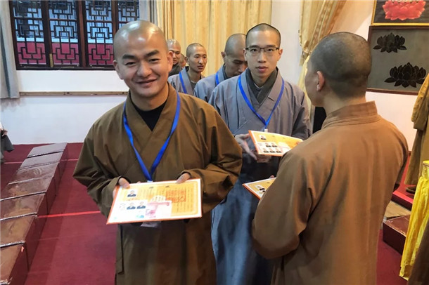 随后,世起法师及诸引礼师父向戒子们颁发戒牒、同戒录。众新戒手持戒牒,无不欢喜感恩,为自己得到清净戒体而感到无上荣耀。