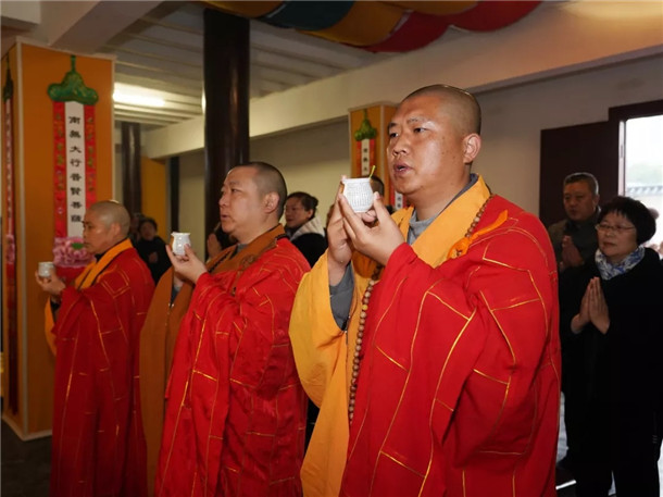 奠基仪式按照佛教传统举行了洒净仪式。杭州市佛教协会会长光泉法师与市属各寺院大德法师共同拈香主法。两序大众诵念《心经》、《大悲咒》,杨枝净水绕场洒净,祈愿佛力加持、龙天护佑,海潮寺复建早日完成。