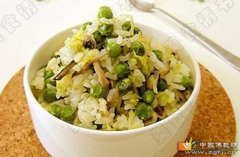 4、煮饭的同时,平底锅烧热,倒入适量油,先爆香香菇丝,然后加入卷心菜丝翻炒,再加入盐和胡椒粉调味,最后倒入豌豆炒匀