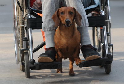 乖乖是桐柏路送变电社区的明星,社区里的居民大多都认识它。乖乖在社区里知名不仅仅是因为每天跟随主人下来遛弯儿遛多了,更是因为作为一只两岁的棕色德国腊肠,有着短短的腿的它,会推轮椅。 乖乖今年两岁,身长有40厘米左右,两只大耳朵,有些害羞,总是用湿漉漉的眼睛望着你。它来到王女士家时刚满月,等到稍大一点,王女士用轮椅推着父亲下楼散步时总带上它。 性格内敛的乖乖总是躲在轮椅下,亦步亦趋。王女士说:乖乖怕见生人,一开始总是把两只前爪搭在轮椅的脚踏板上跟着走。那个时候它还小,有时候还跟不上,不停摔跟头,家人把它从轮椅下抱出来,它还是固执地钻回去。 时间长了,王女士惊奇地发现,乖乖竟然能推轮椅了。王女士说,轮椅上坐着人少说也有100多斤,但乖乖只要看到有人坐上去,马上就开始钻到轮椅下,前爪搭上,后腿一用劲,竟能推着轮椅前行了。 一到直行的路上,王女士就把轮椅交给乖乖,由它掌控,拐弯的时候帮着把一下方向。王女士说,从前面看不到个子小的乖乖,乍一看,还以为轮椅是“无人驾驶”。刚开始小区里的居民看到乖乖推轮椅,都喜欢得不得了,觉得这个狗狗好玩,现在大家都熟悉了,见了乖乖就让路。乖乖已经习惯了每天推轮椅这个活儿,有时候一天不下楼,它还急得满屋转圈。 椅上的人有100多斤,身材娇小的“乖乖”腊肠推起来却不费力。腊肠帮主人推轮椅,喜欢钻到轮椅下的它个子娇小不易发觉,常被人认为轮椅是在“无人驾驶”。
