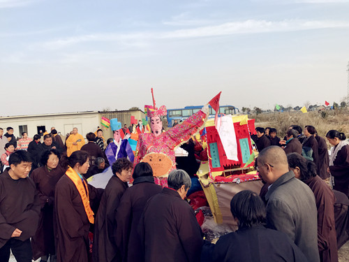 一艘纸糊的西方大船船头,镇坛大将军威严而立,它将护卫参加此次水陆法会的六道亡灵,慈航西渡。大众法师及信众居士起腔念诵,齐唱梵音。在熊熊火光中,西方船满载着众生顺利前往西方极乐世界。